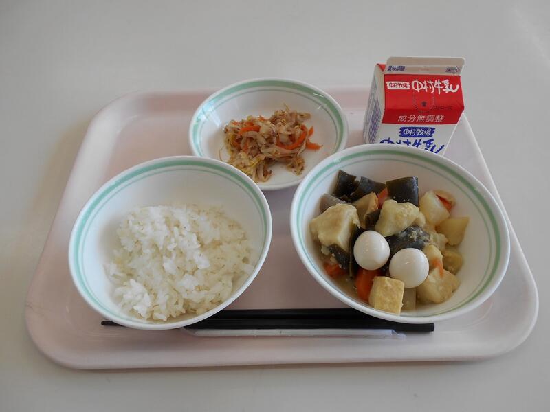 麦ごはん、しょうがみそおでん、白菜のおかか和え、牛乳
