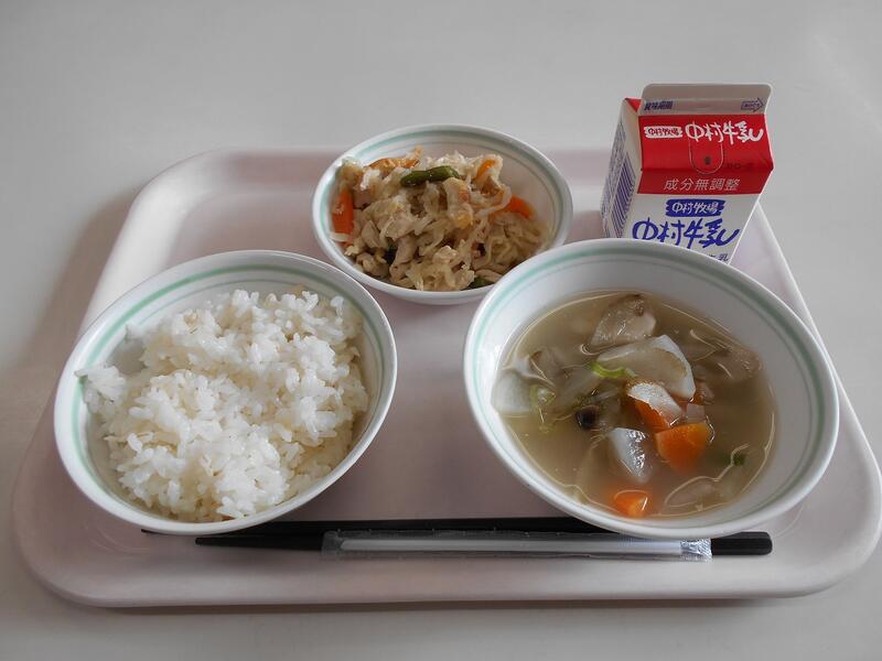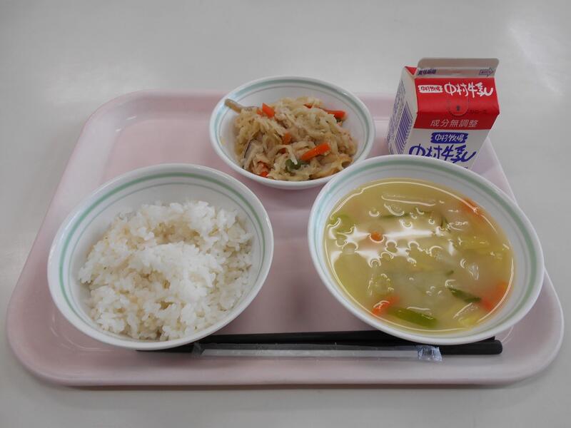 麦ごはん、千切り大根の炒め煮、石狩汁、牛乳