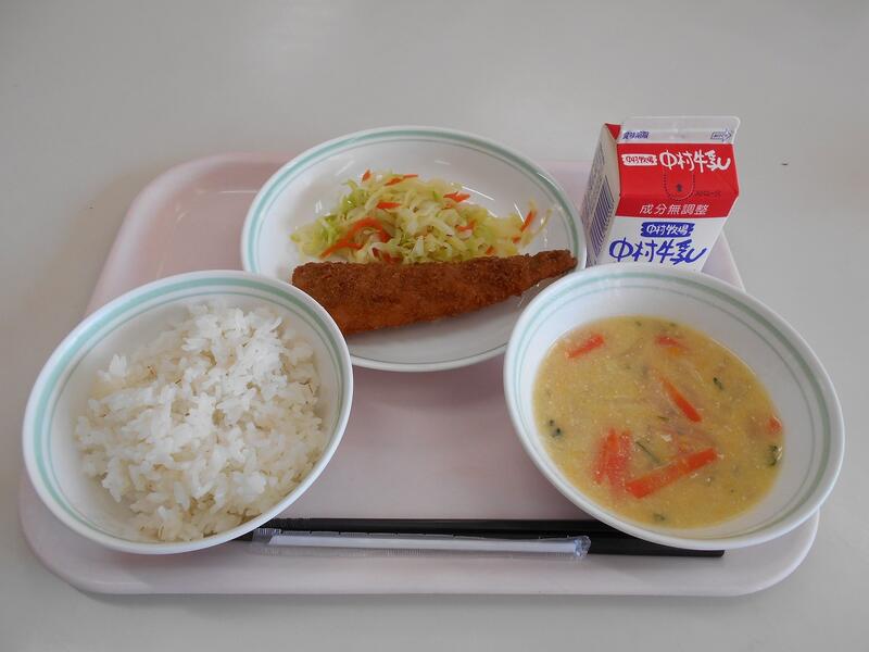 麦ごはん、ほっけのフライ、添え野菜、豆乳コーンスープ、牛乳