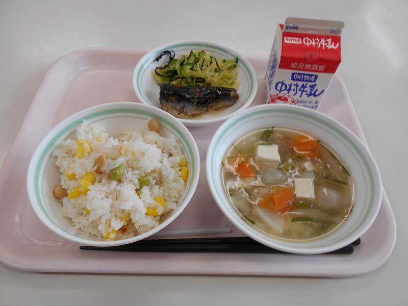 三色豆ごはん、いわし梅煮、昆布和え、けんちん汁、牛乳