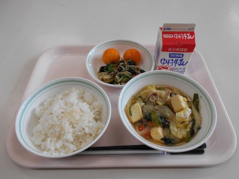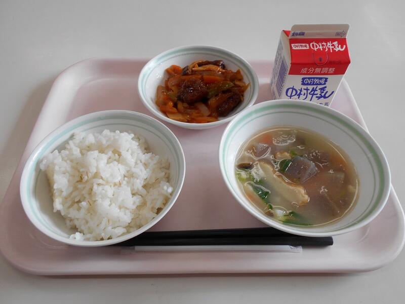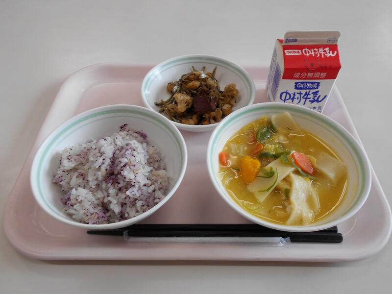 減量ゆかりごはん、さつまいもと大豆の揚げ煮、ほうとう、牛乳