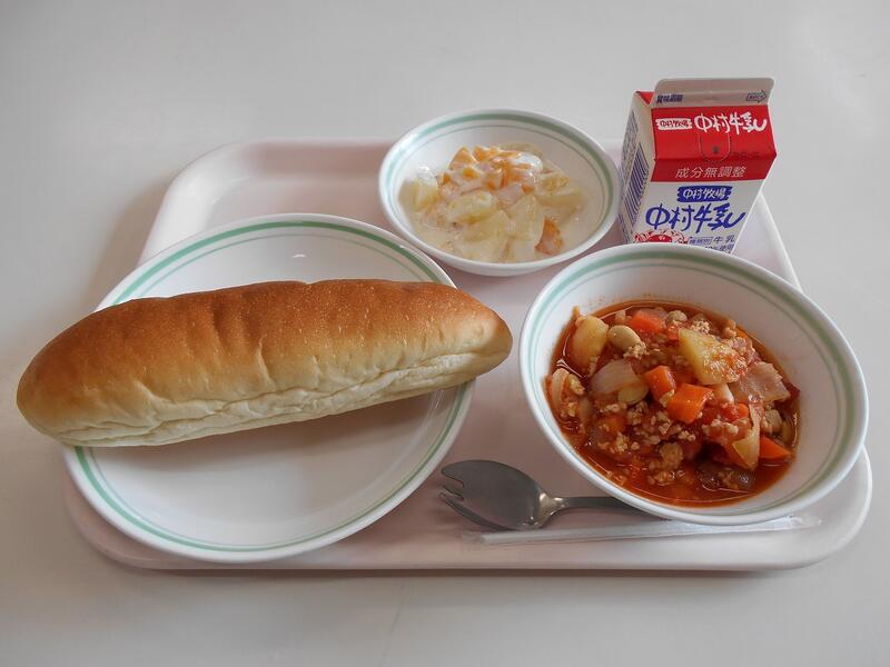 ミルクパン、チリコンカン、フルーツヨーグルト、牛乳