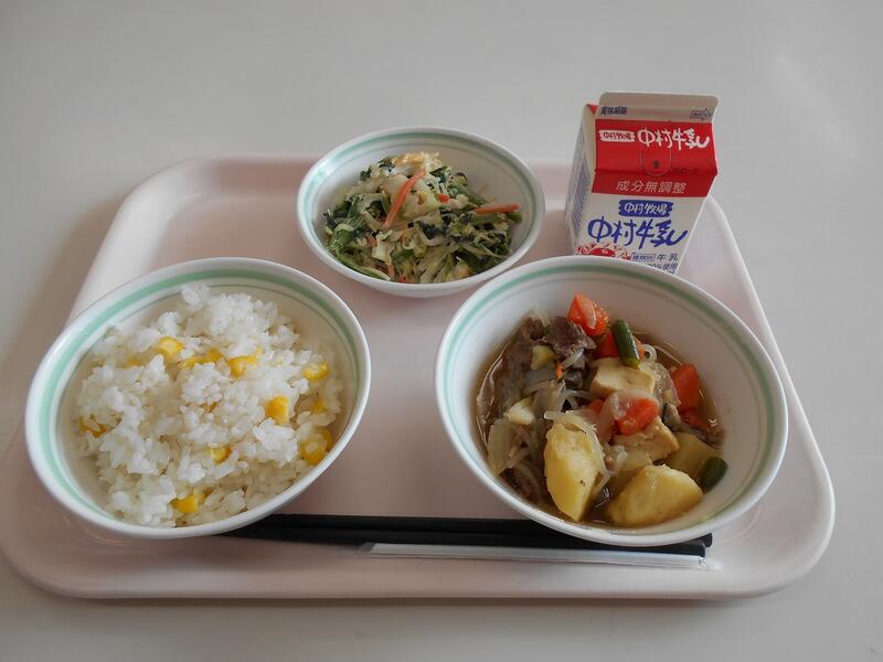 コーンご飯、肉じゃが、野菜のマヨネーズ和え、牛乳