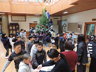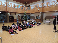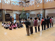 続いて、子どもたち全員で、ホールに置かれた杉の木へのクリスマスツリー飾りです。ツリー飾りのオーナメントを本校の先生方にもらいに行きますが、その際のやり取りの英会話もトリシア先生に教えていただきました。そして、“Ornament please.” “Here you are.” “Thank you.” “Good bye.”などと、子どもたちは実際に先生方と英語でやり取りしながら飾りを受け取りました。そして、もらった飾りをツリーへ飾り付けていきました。