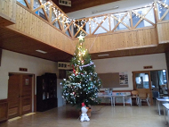 ツリーは4m近い高さがあり、飾り付けは時間内に終わりませんでしたが、ホールは、一気にクリスマスムードに包まれました。ツリーやホール2階の手すりにはイルミネーションも施され、夜のツリーが見てみたくなりました。
