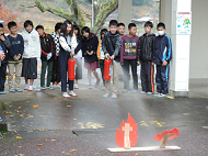 その後、5・6年生が水消火器を使った消火訓練を体験しました。火災を発見したら、まず大声で「火事だ-!!」と叫んで周囲に知らせることの大切さも学びました。火元に見立てた的を目がけて放水し、みんな上手に的を倒すことができました。