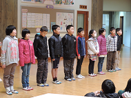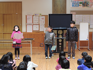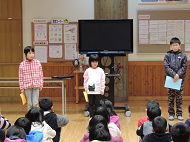 続く4年生の発表では、6つの詩を朗読・群読してくれました。2人ずつペアで一つの詩を朗読し、最後に全員での群読でした。実は4年生は、インフルエンザの発生などがあり、10名全員揃ったのは昨日久しぶりでした。揃っての練習がなかなかできない中での今日の発表だったと思います。しかし、みんなしっかり自分の受け持ちの詩を暗唱しており、詩のもつ美しい言葉や文章を全校児童に伝えようと、落ち着いた声と雰囲気で頑張ってくれました。やがて高学年になろうとする成長ぶりの見られる発表でした。