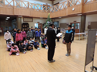 はじめに、トリシア先生から、アメリカのクリスマスについて、由来やクリスマスにおける習慣などをお話しいただきました。クリスマスプレゼントはツリーの下に飾っておき、12月25日でないとプレゼントは開けられないそうで、その前に開けるとプレゼントがもらえなくなるという言い伝えがあり、日本と違う興味深い話もありました。