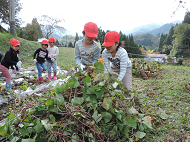 さて、今回採れたかぼちゃのようなサツマイモには、地域の方も「なんでじゃろかい?」と不思議がっておられました。インターネットで調べると、どうも苗の植え方が原因??かもしれません。来年に向けての課題となりました。☆ みんなの顔くらいでっかく重たいおいもがたくさんとれましたね!早く食べたいですね。おいしい芋料理を作って、協力してくださった方々にもごちそうしてくださいね!