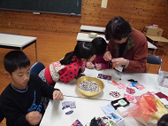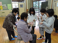 1・2年生は、「昔の遊び」。あやとりやメンコ、お手玉、羽子板、紙飛行機など、おばあちゃん方と一緒にいろいろな昔の遊びを楽しみました。