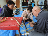 3・4年生は、「竹とんぼ作り」と「おじゃみ作り」に分かれました。おじいちゃん方から小刀やのこぎりなどの使い方を習いながら、慣れない手つきで難しい竹とんぼ作りに挑戦しました。おばあちゃん方からは、針と糸を使って縫い方を教わり、ハギレを袋状に縫って数珠玉を詰め、おじゃみを完成させました。できあがった竹とんぼを飛ばしてみたり、たくさんのおじゃみを抱えたりして、とてもうれしそうでした。