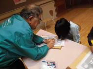 終わりの会の後、子どもたち全員が、おじいちゃん、おばあちゃん方一人一人とお礼の気持ちを込めて握手をして、交流会が終わりました。