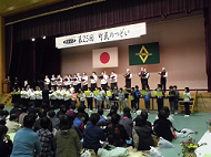 当日は、高千穂町内の2つのコーラスグループ「コーラス高千穂きらきら星」「高千穂町老人クラブホオジロコーラスグループ」と押方小4~6年生23名が、「町歌」と「もみじ」を合唱しました。
