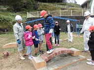 「レンガで橋造り」では、班で協力してレンガを組み合わせ、隙間に砂を埋め込んでアーチ状の橋を造りました。アーチ橋が完成すると子どもたちも大喜び。そして、できあがった橋を一人ずつ恐る恐る渡りました。