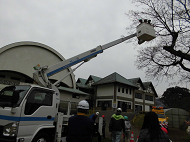 「高所作業車試乗体験」は、2名ずつゴンドラに乗りました。アームが延びていくとどんどん高くなります。最高で12mほど上がるそうですが、校庭の大きなセンダンの木の実を取る子や、高い場所から大きく手を振る子もいました。中には、高い所が苦手で、すぐに降ろしてもらう子もいたようです。