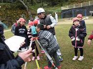「光波で距離当て」では、自分でソフトボールを投げて、飛んだ距離を予想し、光波測距儀で計測しました。そして、予想との誤差により順位が決まるというゲームでした。他にも運動場のいろいろな場所を指定して、そこまでの距離を図ってみたりしました。