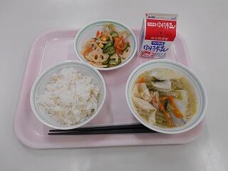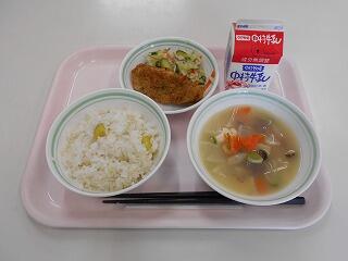 麦ごはん、牛乳、磯マヨネーズ和え、五目スープ