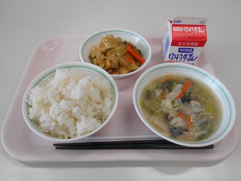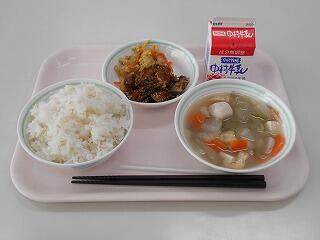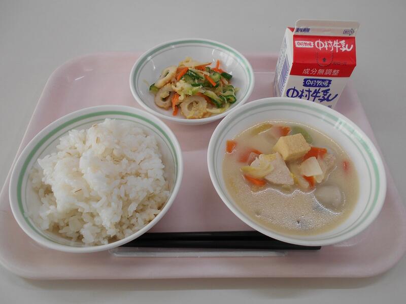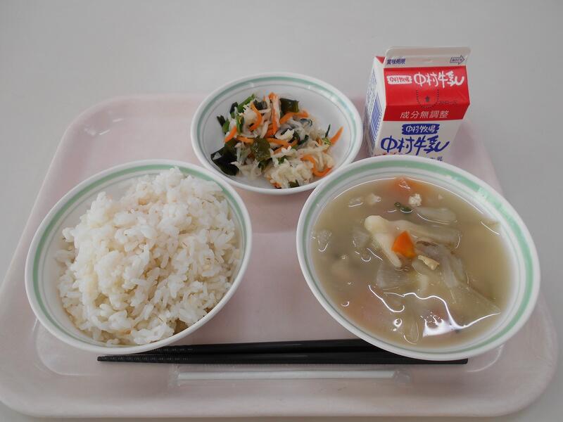 千切り大根の和え物、団子汁、麦ごはん、牛乳