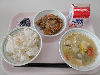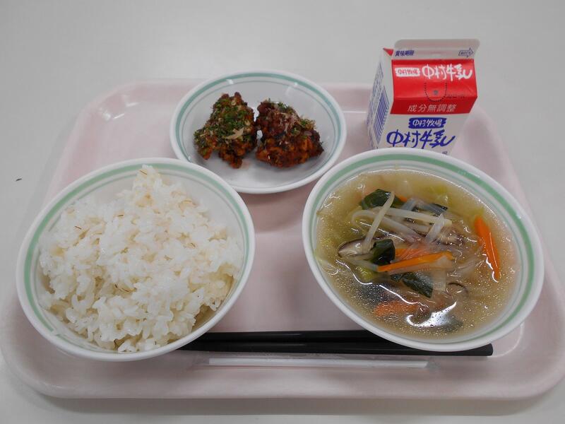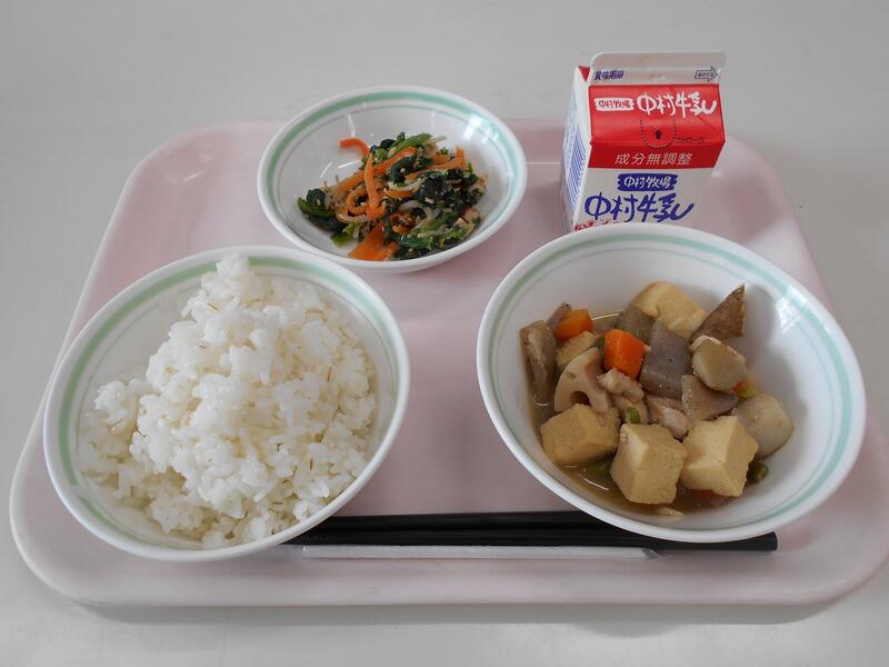 麦ごはん、牛乳、いわしの変わり揚げ、白菜のごま和え、のっぺい汁