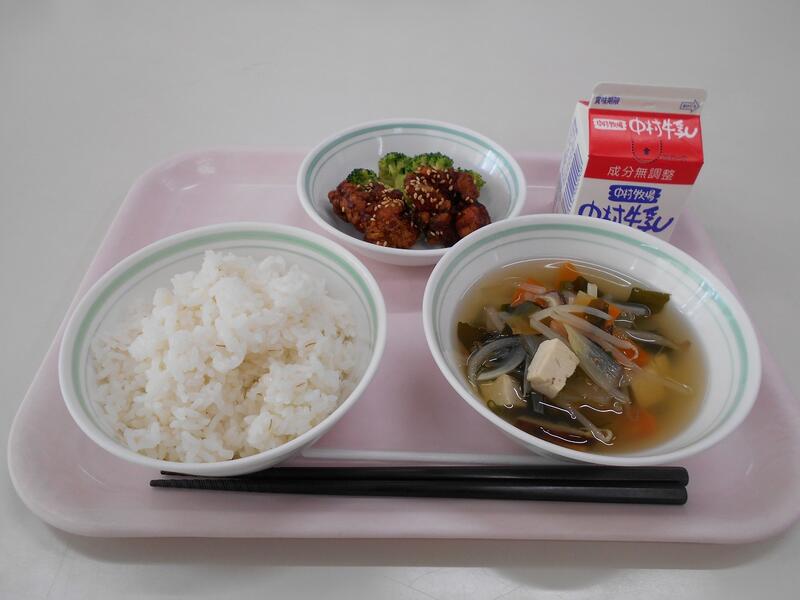 ヤンニョムチキン、ブロッコリー、わかめスープ、麦ごはん、牛乳