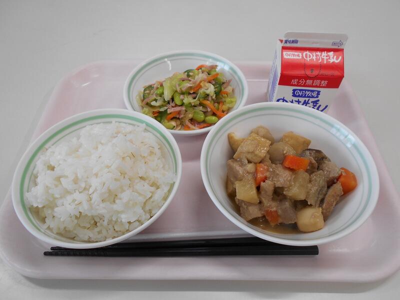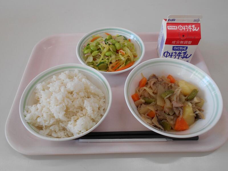 肉じゃが、青豆サラダ、麦ごはん、牛乳