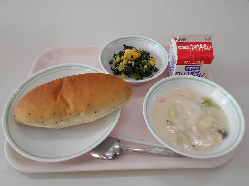ごまパン、クリームシチュー、ほうれん草とコーンのサラダ、牛乳