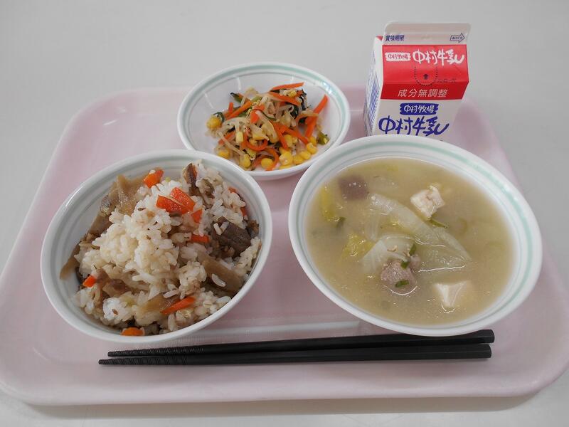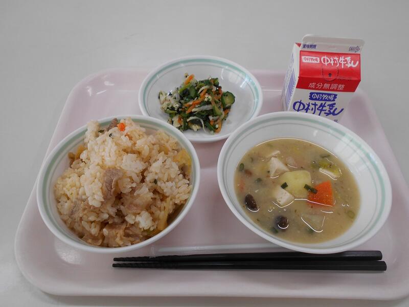 キムタクご飯、きのこの味噌汁、千草和え、牛乳