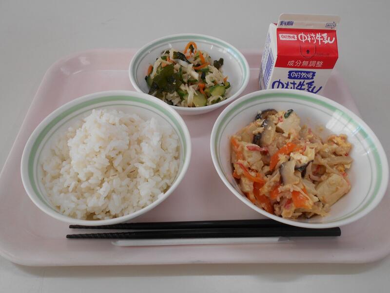 かに豆腐、千切り大根のさっぱり和え、麦ごはん、牛乳