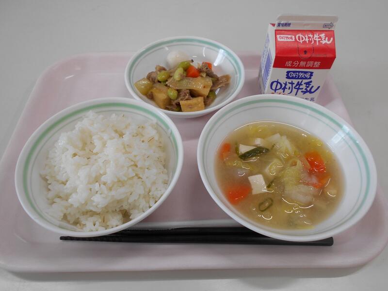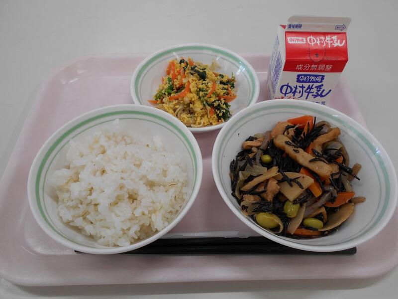 きんぴらごぼう、呉汁、しそ味ひじき、麦ごはん、牛乳