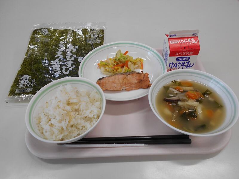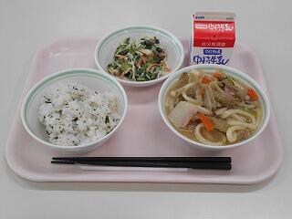 減量わかめごはん、牛乳、神楽うどん、小松菜のおかかマヨネーズ和え