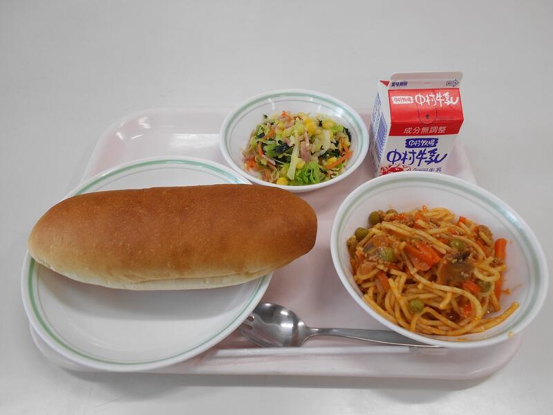 ミルクパン、ミートスパゲティ、コーンサラダ、牛乳
