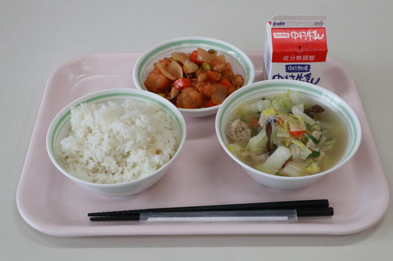 魚のチリソース煮、白菜と肉団子のスープ、麦ごはん、牛乳