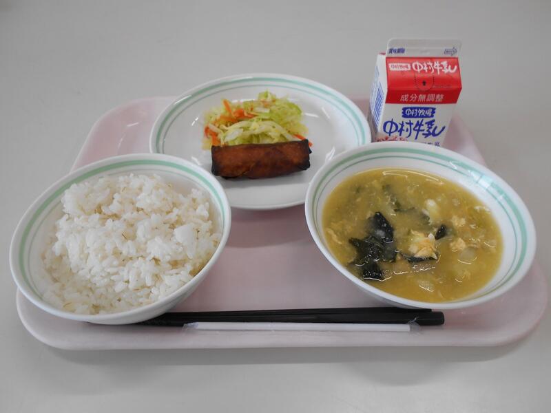 厚揚げの磯煮、ふぶき汁、麦ごはん、牛乳、メープルケーキ