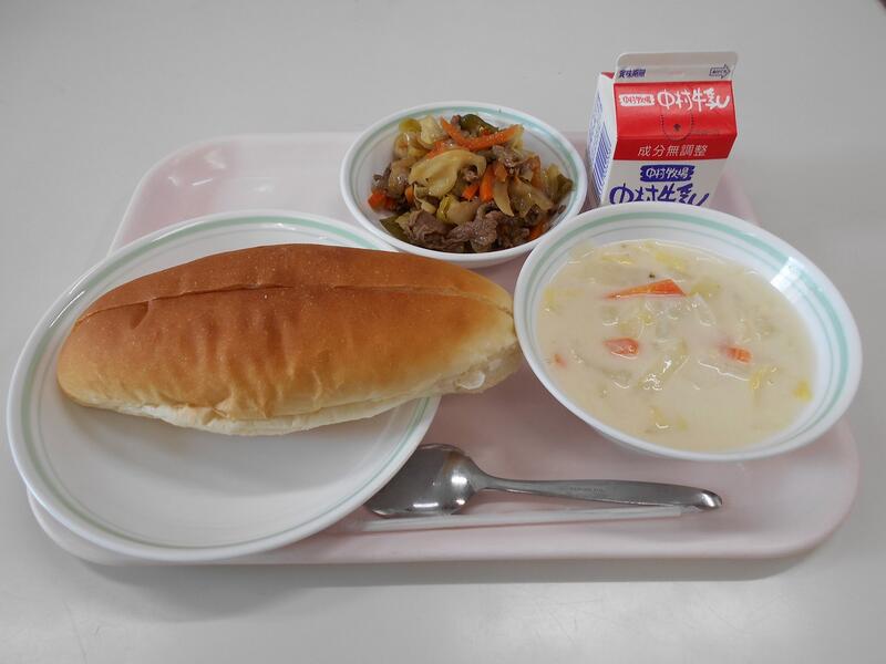黒糖パン、スープスパゲティー、ブロッコリーサラダ、牛乳