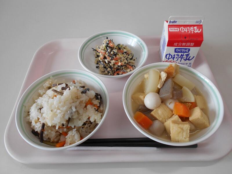 鶏みそおでん、ひじきの白和え、山菜おこわ、牛乳