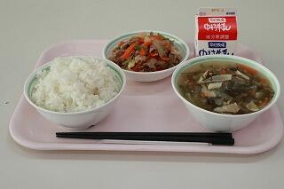 麦ごはん、牛乳、豚肉のしょうが炒め、もずくのスープ