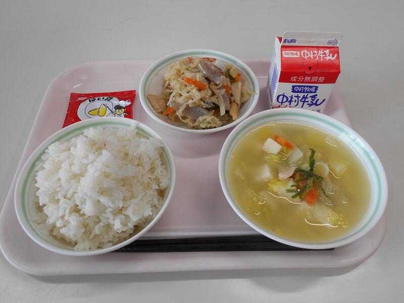 千切り大根の炒め煮、石狩汁、麦ごはん、ふりかけ、牛乳
