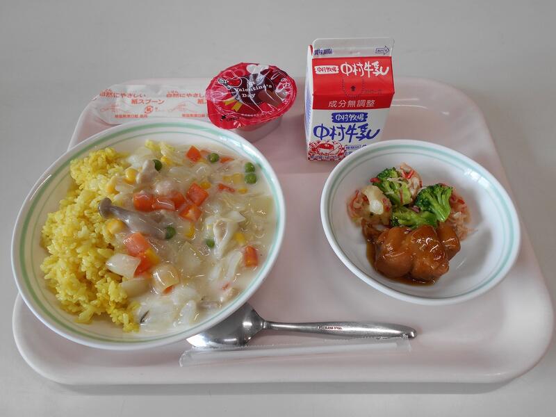 照り焼きチキン、クリームかけピラフ、ボイルブロッコリー、牛乳、