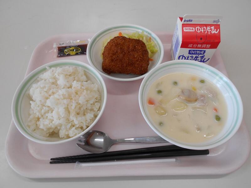 とんかつ、添え野菜、コーンチャウダー、麦ごはん、牛乳
