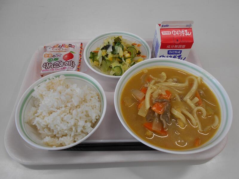 カレーうどん、海藻サラダ、麦ごはん、牛乳、デザート
