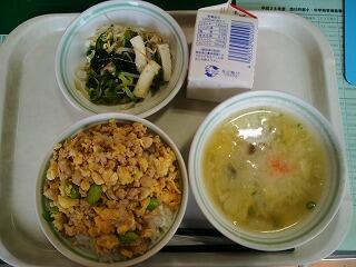 麦ごはん、牛乳、高野豆腐の卵とじ、春雨の酢の物