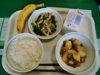 麦ごはん、牛乳、じゃがいものうま煮、ツナとわかめの酢の物
