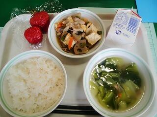 麦ごはん、牛乳、回鍋肉(ホイコーロー)、きのこのそぼろ汁