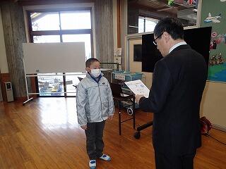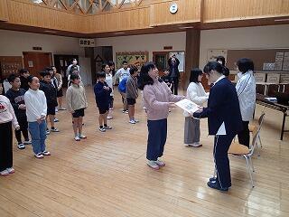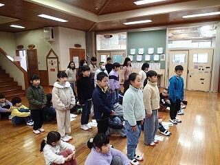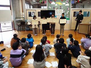 雪の降る寒い朝でしたが、ホールに集まって全校朝会を行いました。まず、校長の話では自分の経験を基に読書をするよさについて話しました。次に2月の月目標「自信をもって発表しよう」や読書活動について担当の先生が話をしました。最後に習い事や授業で取り組んだお米新聞の表彰と体力テストでA判定だった子どもたちの紹介をしました。寒さに負けず、最後までしっかりとした態度で話を聞く子どもたちでした。