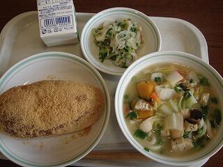 『揚げパン、ほうとう、リンゴサラダ、牛乳』
