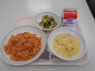 チキンライス、牛乳、チーズスープ、ブロッコリーサラダ