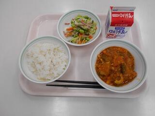 麦ごはん、牛乳、魚のチリソース煮、吉野汁