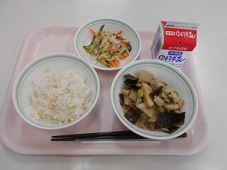 麦ごはん、牛乳、厚揚げの中華煮、キクラゲの酢の物