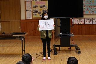 12月3日(火)の朝、全校朝会を行いました。まず、前日にあった学校支援訪問で、あいさつや学習態度など、たくさんの子ども達の素晴らしいところを教育委員会の方々に褒めていただいたことを伝えると、とてもうれしそうにしていました。また、人権の花の活動を通して、花の世話をこれからもがんばることや、9月に蒔いた花の苗が根をしっかりと伸ばしている様子を見せ、子ども達も素敵な大人になるために、今は勉強面や生活面などで土台となる根を育てましょうと伝えました。子ども達は大事だと思ったことをメモして話を聞いていました。その後、生徒指導主事や委員会の子ども達が12月の生活目標とSDGsと関連させた整理整頓「ピカピカ大作戦」について発表し、子ども達は掃除や片付けに対して意欲をもったようでした。最後に表彰を行いました。バレーボール、剣道、図工などいろいろな分野で頑張っている子ども達をみんなで祝福しました。