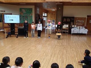 運営委員会の企画で全校児童による第2回自慢大会がありました。先生方も参加して、子どもたちの発表を楽しく見ました。発表内容は、なわとびや合奏など授業中にがんばったことだけでなく、習い事や最近はまっている事、趣味など様々なジャンルを発表しました。中には、オリジナルの物語を作って読み聞かせをする子どもやプロ顔負けの手品を披露する子どもなどもいました。最後は校長先生がギターの弾き語りをされ、あっという間に昼休みが終わるほど盛り上がった自慢大会でした。人前で自分を堂々と表現し、それをあたたかく受け入れる素敵な雰囲気があるのが押方小学校のよさの一つです。